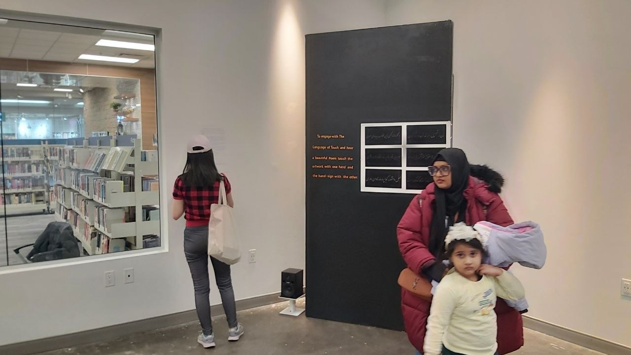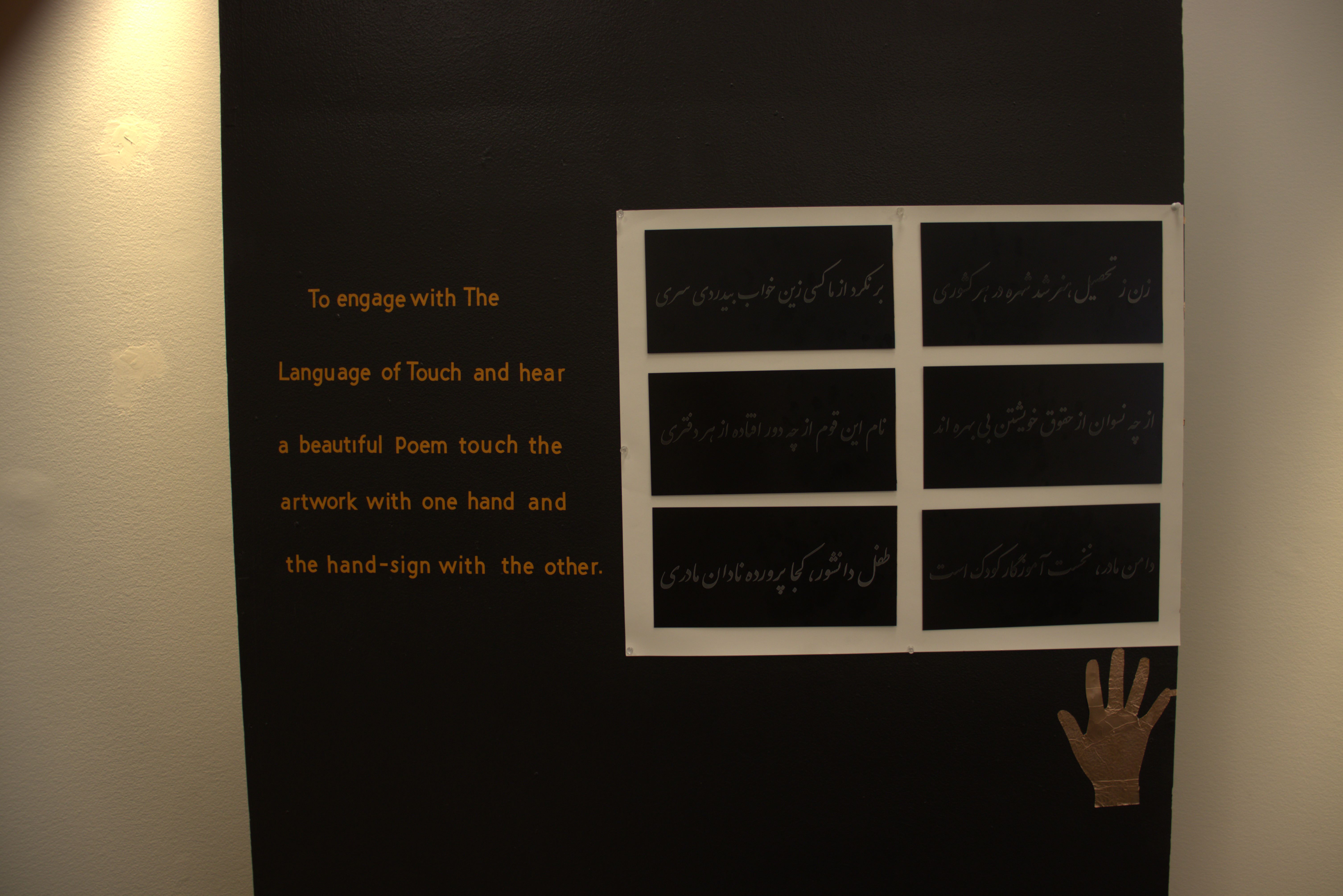 The Language of Touch is an interactive wall installation where audiences activate engraved Persian poetry by touching aluminum plates. Through calligraphy, sound, and touch, the work confronts viewers with a language barrier, mirroring the emotional distance and cultural exclusion migrants experience through translation and communication.